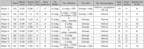 Resultados: Un total de 10 mujeres con una edad media de 53 años fueron diagnosticadas de fasciosis plantar, edema óseo de calcáneo y neuropatía compresiva de Baxter mediante diferentes pruebas, como la ecografía. Estas pacientes fueron tratadas mediante infiltraciones de colágeno, extracción del líquido sanguinolento del calcáneo, terapia electrolisis percutánea intratisular, soportes plantares, tratamiento farmacológico y ondas de choque. El 40 % de la muestra se encontraba de baja laboral debido al dolor incapacitante de esta tríada y el 10 % en situación de jubilación.