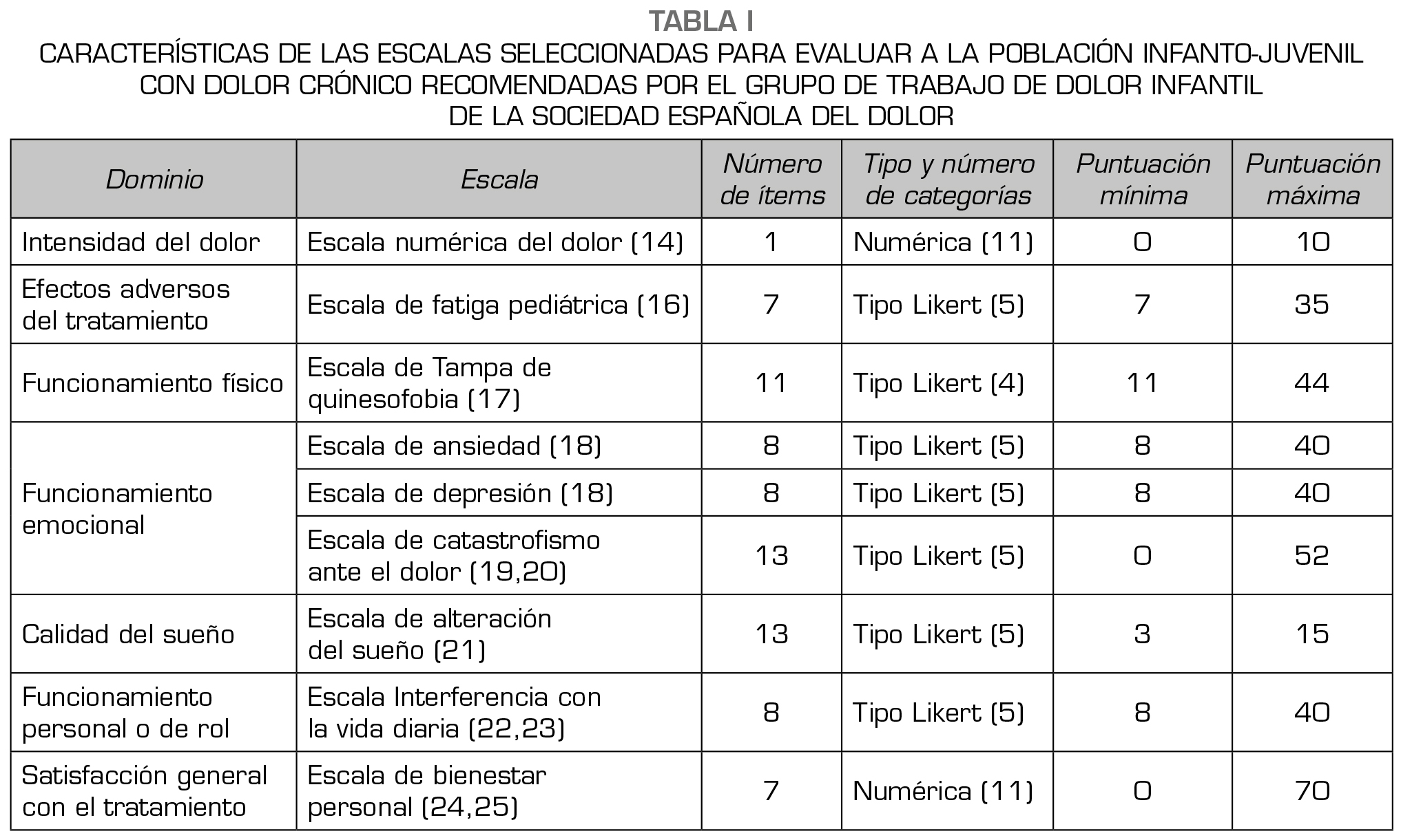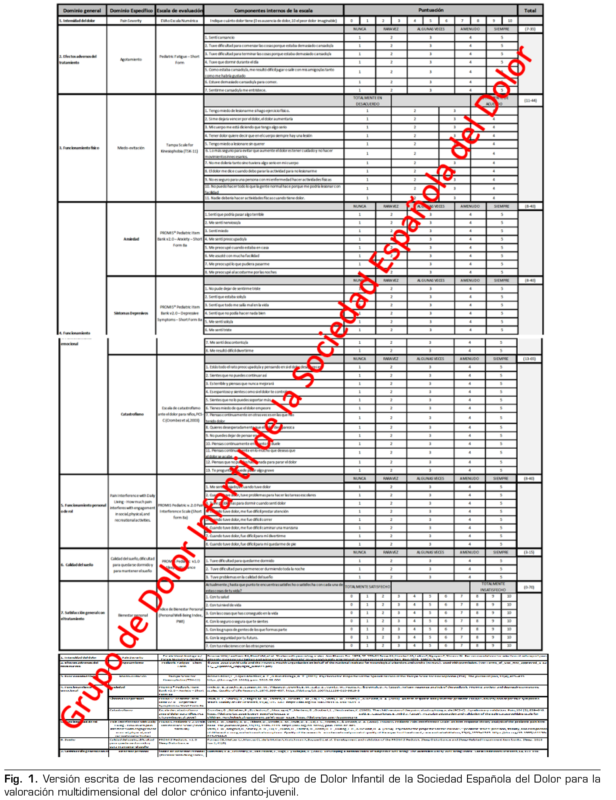 Material and methods: The consensus was completed by consulting and incorporating the participants ´comments at a National Conference on Childhood Pain at which these domains and measures were presented. There was a consensus among the investigators that seven domains should be included: pain intensity; physical functioning; emotional functioning; personal or role functioning; adverse effects and events; sleep; and global assessment of satisfaction with treatment. For each domain, those scales with validated version in Spanish and freely available were selected although choosing them with the best psychometric qualities.