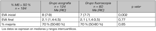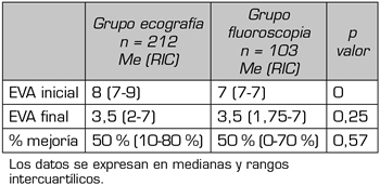 Resultados: Los valores de EVA final de los pacientes que se realizaron el bloqueo mediante radioscopia y la de aquellos que lo realizaron ecoguiado fue similar, con un resultado final de 3,5 (mediana), así como el porcentaje de mejoría subjetiva que también fue similar en ambos grupos, alcanzando esta el 50 %.