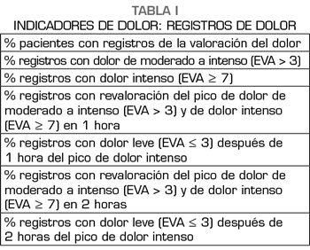 A falta de indicadores de dolor agudo propuestos por las sociedades científicas, se definieron aquellos que consideramos imprescindibles para evaluar la eficiencia del dolor intrahospitalario, con especial énfasis en la eficacia de las acciones emprendidas ante un dolor intenso con el objetivo de identificar problemas e implementar medidas de mejora.