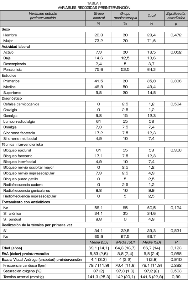 Material y método: Estudio cuasi experimental con grupo control, prospectivo, pre y postintervención, transversal, no aleatorizado. Aprobado por el Comité Ético de Investigación IDC Salud Catalunya. Población estudio: pacientes programados para realización de TI en la UD. Criterios inclusión: > 18 años de edad. Indicación de TI. Criterios exclusión: trastorno psiquiátrico, incapacidad contestar variables de estudio. Grupo intervención: se ha realizado la TI reproduciéndose aleatoriamente la música elegida, libre de contaminación acústica. Grupo control: se ha realizado la TI sin musicoterapia.