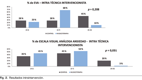 En el grupo control el valor de la escala visual analógica intra es de 4,3 (SD 3,1) y en el grupo de musicoterapia de 3,0 (SD 2,0), esta diferencia sí es estadísticamente significativa (F = 4,83, p = 0,031).