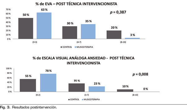 En el grupo control el valor de la escala visual analógica post es de 2,7 (SD 2,8) y en el grupo de musicoterapia de 1,3 (SD 1,5); esta diferencia también es estadísticamente significativa (F = 7,427, p = 0,008).