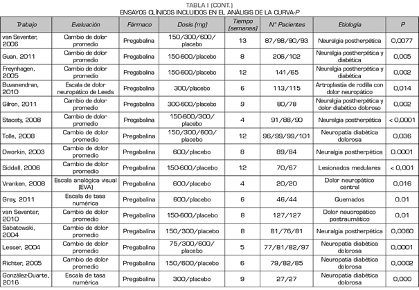 Métodos: Se realizó una búsqueda bibliográfica seleccionando ensayos clínicos aleatorizados que evaluaban la eficacia de pregabalina, gabapentina y duloxetina en dolor neuropático. Se aplicó el análisis de curva-p de los estudios con resultados estadísticamente significativos para estudiar su distribución.
