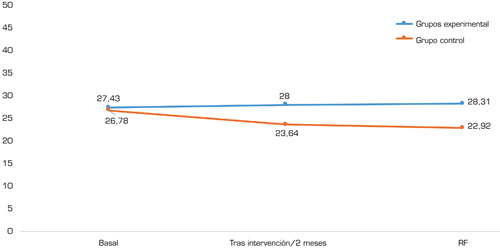 En el grupo experimental la calidad de vida aumenta en todas sus dimensiones respecto a la medición basal tanto tras la intervención como tras la RF. No ocurre así en el grupo control, en el que se observa disminución significativa, hasta el triple en el caso de “rol físico” o mantenimiento relativo de algunas puntuaciones. Es más, excepto en salud general, vitalidad y salud mental, en el resto de las dimensiones del cuestionario la puntuación obtenida tras la RF es menor que la basal.