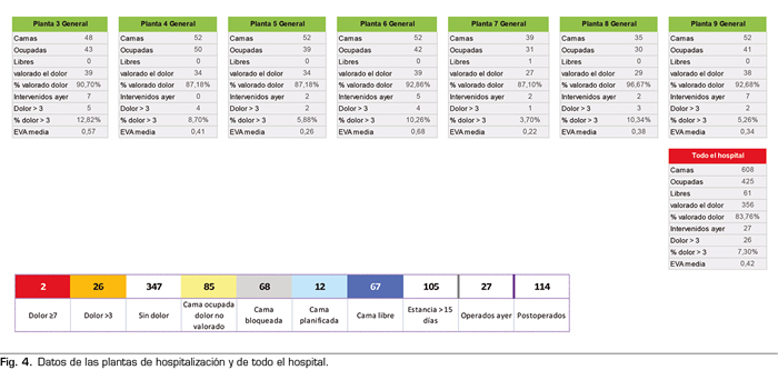 The pain map identifies with different colors as a traffic light of pain. In green color, the EVN values are between 0-3 (mild pain), orange EVN between 4 and 6 (moderate pain) and red color between 7 and 10 (intense pain). Likewise, it indicates with a purple band those patients operated on the previous day, facilitating pain control during the first 24 postoperative hours.
