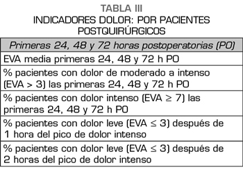 postquirúrgico no se presenta tan solo durante las primeras 24 horas, sino también entre las 48 y 72 horas, que es cuando el paciente postoperado intensifica la movilización, fisioterapia respiratoria, rehabilitación, etc., se establecieron indicadores durante todo este periodo. Los resultados de estos indicadores de dolor agudo postoperatorio nos han permitido revalorar los protocolos de pauta analgésica, sobretodo en aquellas cirugías fast-track donde es clave la optimización analgésica al alta precoz.