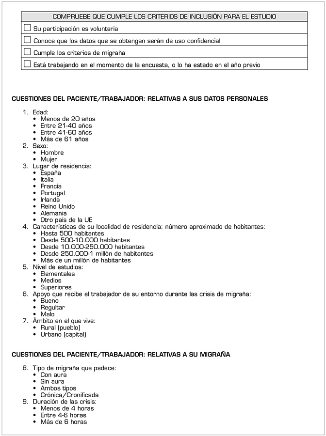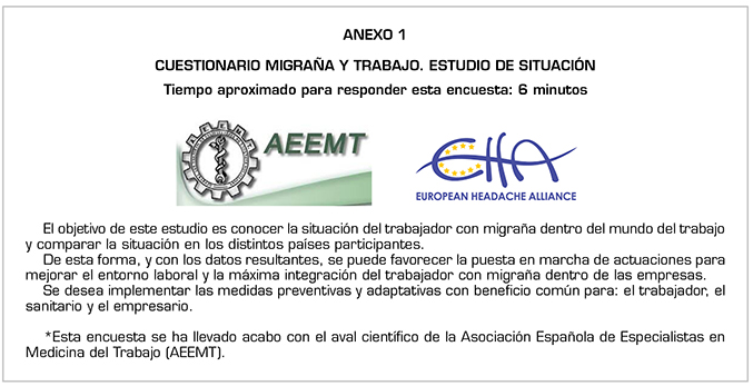 Estudio observacional transversal a partir de una encuesta anónima vía web ubicada en la página de la European Migraine and Headache Alliance (EMHA) y avalada científicamente por la asociación española de especialistas en medicina del trabajo (AEEMT) a 3342 pacientes de España, Italia, Francia, Portugal, Irlanda, Reino Unido, Alemania y otros países de la Unión Europea no incluidos entre los anteriores. Se consideran criterios de inclusión tener un diagnóstico previo de migraña, estar trabajando en el momento de la encuesta o haberlo estado en el año previo, y participación voluntaria. Se recogen datos desde septiembre de 2018 hasta enero de 2019. La encuesta consta de 32 cuestiones con respuesta múltiple (Anexo 1).