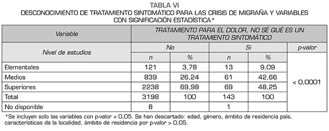 En nuestro trabajo, el uso de tratamientos sintomáticos no se ve influido por el número de habitantes de la localidad, pero el nivel de estudios sí condiciona el tratamiento sintomático utilizado, siendo mayor el de AINE y triptanes en personas con estudios superiores y, por el contrario, el desconocimiento de los tratamientos o no uso de los mismos predomina en pacientes con estudios elementales o medios.