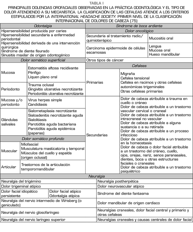 La mayor parte de las consultas odontológicas están relacionadas con dolores intraorales que afectan a estructuras dentarias, periodontales y mucosas. Aunque generalmente la causa originaria del dolor y la estructura afectada coinciden en la localización, en ocasiones el dolor orofacial y, particularmente, el dolor oral, es referido. Esto es, el dolor puede deberse a procesos de origen extraoral localizados fuera del territorio maxilofacial. De igual manera, determinados trastornos orales, como un desequilibrio oclusivo, pueden afectar también estructuras extraorales, ocasionando tensión y dolor en cuello, cabeza y espalda. La investigación en dolor orofacial es, sin embargo, una disciplina emergente en comparación con otras áreas anatómicas, quizás debido, en parte, a que el dolor tiende a remitir con el tiempo o con la sanación del tejido afectado (si hubiera una lesión). Sin embargo, la mitad de los pacientes con algún tipo de dolor orofacial lo sufre de manera crónica y, a diferencia del dolor agudo, remitente, el dolor crónico no es ya un síntoma, sino una patología de difícil manejo, con escasa o ninguna relación con los mecanismos que lo originaron. Además, la falta de una adecuada anamnesis y exploración clínica, nomenclaturas inapropiadas o la dificultad de diagnóstico, hacen complicado en ocasiones un óptimo abordaje terapéutico. La mayoría de las clasificaciones de dolor oral siguen atendiendo a la estructura anatómica afectada más que al propio mecanismo nociceptivo. Por otra parte, la etiología exacta de muchas algias denominadas atípicas o del síndrome de boca ardiente sigue siendo desconocida. Esta revisión pretende describir los principales motivos de consulta por dolor en la clínica dental, poniendo particular énfasis en el tipo de dolor desde el punto de vista de su mecanismo: nociceptivo, inflamatorio, neuropático, psicogénico o mixto.