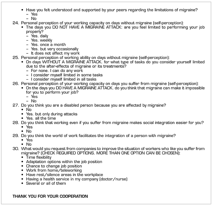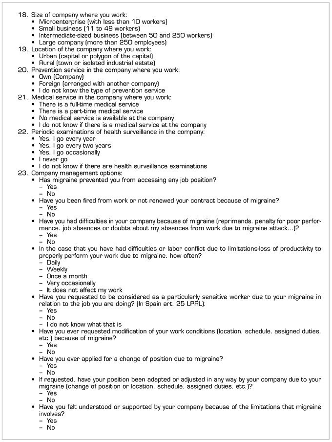 A cross-sectional observational study based on an anonymous web-based survey located on the European Migraine and Headache Alliance (EMHA) website and scientifically endorsed by the Spanish Association of Specialists in Occupational Medicine (AEEMT) to 3342 patients in Spain. Italy. France. Portugal. Ireland. United Kingdom. Germany and other countries of the European Union. A previous diagnosis of migraine. be working at the time of the survey or have been working in the previous year. and participate voluntarily were considered inclusion criteria. Data were collected from September 2018 to January 2019. The survey consists of 32 questions with multiple responses (Annex 1).