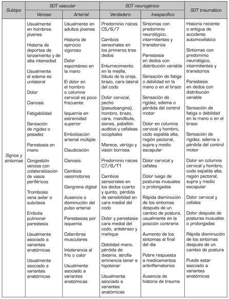 Thoracic outlet syndrome (SOT) is a controversial condition to this day, caused by compression of neurovascular structures in their passage between the neck and thorax. It is classified as vascular and neurogenic. If the electrophysiological tests are not positive it is subclassified as nonspecific neurogenic. This is between 95-98 % of cases, but its diagnostic criteria are not yet clear. The main aspects to be taken into account during the clinical examination are reviewed to guide the diagnosis of patients with nonspecific neurogenic SOT, such as symptoms, triggers, differential diagnosis, assessment scales and psychosocial factors.