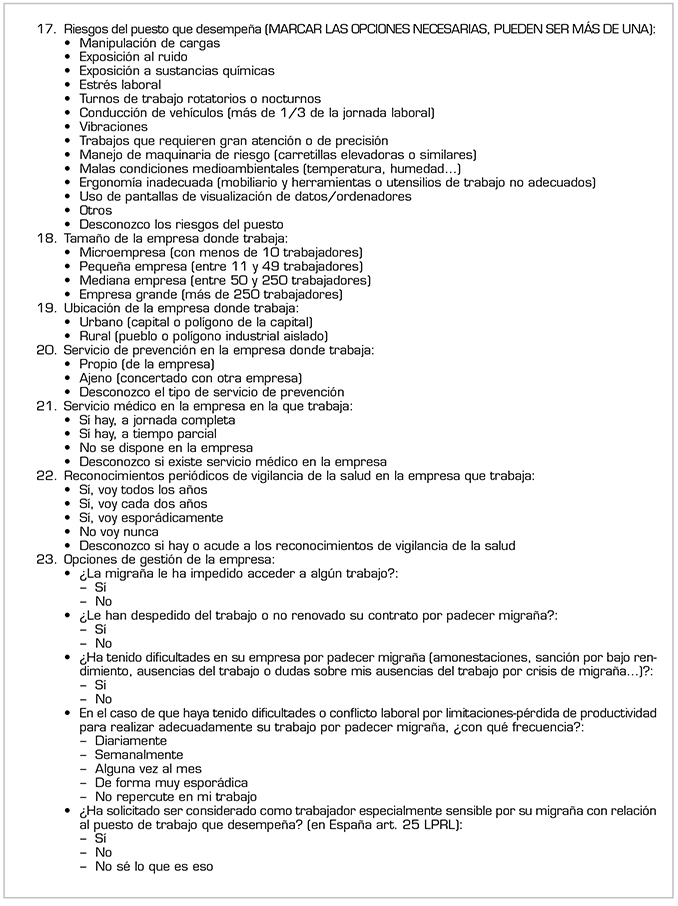 Estudio observacional transversal a partir de una encuesta anónima vía web ubicada en la página de la European Migraine and Headache Alliance (EMHA) y avalada científicamente por la asociación española de especialistas en medicina del trabajo (AEEMT) a 3342 pacientes de España, Italia, Francia, Portugal, Irlanda, Reino Unido, Alemania y otros países de la Unión Europea no incluidos entre los anteriores. Se consideran criterios de inclusión tener un diagnóstico previo de migraña, estar trabajando en el momento de la encuesta o haberlo estado en el año previo, y participación voluntaria. Se recogen datos desde septiembre de 2018 hasta enero de 2019. La encuesta consta de 32 cuestiones con respuesta múltiple (Anexo 1).