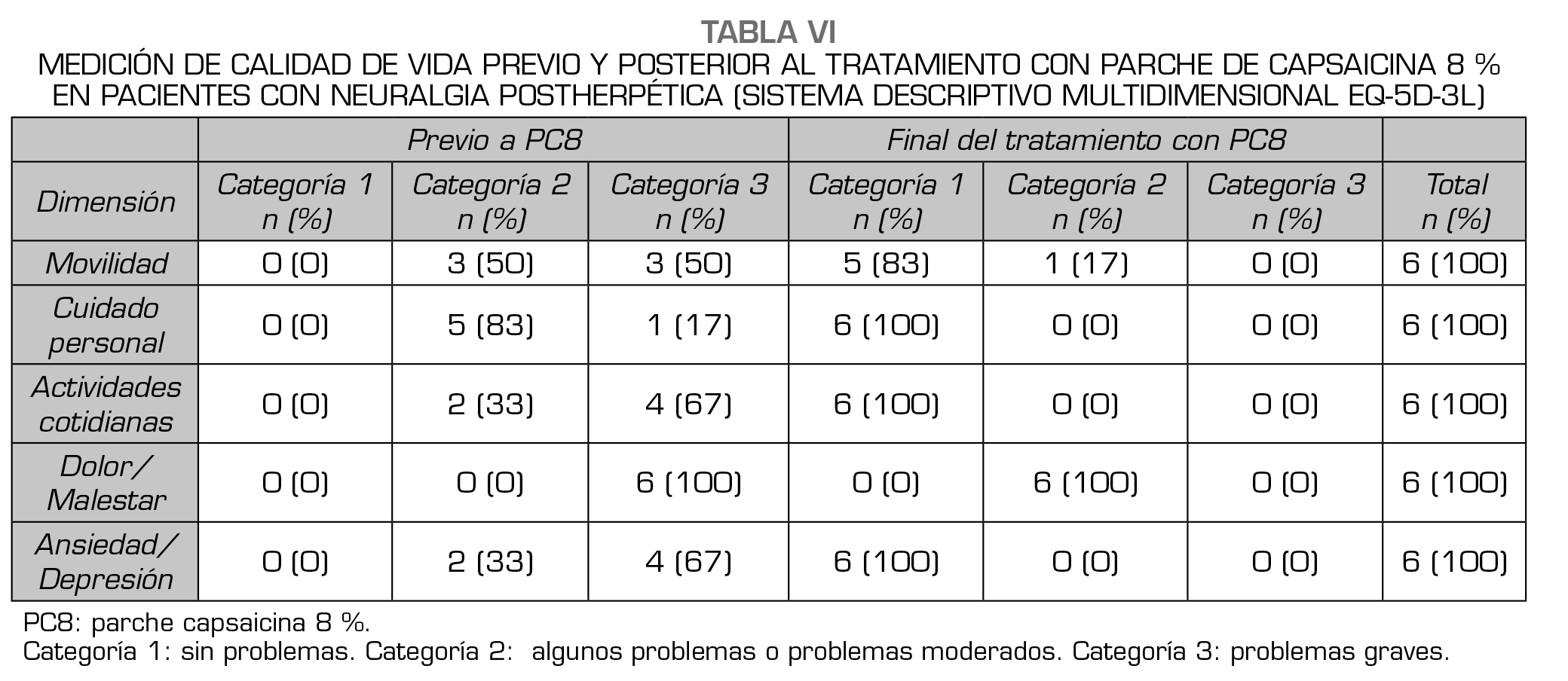 Métodos: Se seleccionaron los pacientes con dolor neuropático localizado probable o definitivo, perfil sensitivo de ‘nociceptor irrititable’ (alodinia mecánica), y Cuestionario DN4 ≥ 3/7. El resultado primario de la eficacia terapéutica fue la disminución de la intensidad del dolor espontáneo, alodinia mecánica y tamaño del área dolorosa entre el estado basal y el último tratamiento. Se evaluó, además, mejoría en la calidad de vida, reducción de consumo concomitante de analgésicos orales y tolerabilidad del fármaco. Se realizaron evaluaciones mensuales, con aplicaciones periódicas de PC8 siguiendo las normas europeas y según la ficha técnica. Se evaluó calidad de vida con escala EuroQoL-5D-3L.