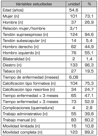Results: Mean age 54.6 years (n = 138). Female (73.1 %; n = 101); female to male ratio 3:1. Supraspinatus tendon (94.6 %; n = 124), subscapularis (5.4 %; n=14); left shoulder (55.1 %; n = 76), right shoulder (44.9 %; n = 62). Bilateral 1.4 % (n = 2). Right handed 96.3 % (n = 133); Personal history: smoking (19.5 %; n = 27), diabetes (7.2 %; n = 10); disease time averaged 6.08 months; acute-subacute pain (less than 3 months) 47.1; (n = 65), chronic pain (greater than 3 months) 52.9 % (n = 73). Radiological type: formative 75.3 % (n = 104); resorptive 24.7 % (n = 34). Average number of sessions: 20.5. Treatment complications 2.8 % (n = 4): intolerance/erythema/burn. Occupation: administrative 39.8 % (n = 55), manual jobs 60.2 % (n = 83).