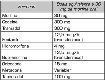 *Uso de 5:1 para conversión de metadona a morfina oral. (Fuente: Mercadante S, Casucio A, Calderone L. Rapid switching from morphine to methadone in cancer patients with poor response to morphine. J Clin Oncol. 1999;17[10]:3307-12. DOI: 10.1200/JCO.1999.17.10.3307.).
