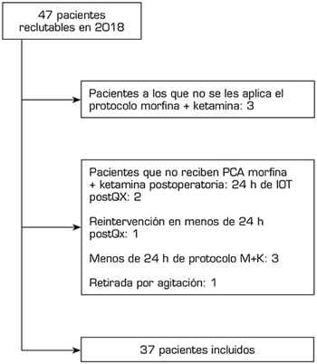 En el grupo control se incluyeron 43 pacientes. En el grupo ketamina, se incluyeron 37 de los 47 pacientes en tratamiento crónico con opioides intervenidos en 2018. Se excluyeron 10: en 3 no se aplicó el protocolo morfina-ketamina (M-K) y en 7 no se aplicó en su totalidad (Figura 1).