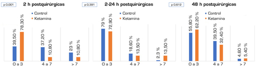 De la historia clínica electrónica de los pacientes, solo se pudieron obtener datos de la dosis de los bolus de morfina administrados durante las primeras 24 h postquirúrgicas. En el grupo control, durante las 2 primeras h posquirúrgicas se administró una media de 2,47 mg de morfina i.v. (2-10 mg). Entre las 2 y las 24 primeras horas, se administró una media de 0,49 mg (0-10 mg). En el grupo ketamina, durante las 2 primeras horas se administró una media de 1,69 mg de morfina i.v. (0-8 mg). Entre las 2 y las 24 h, se administró una media de 0,62 mg (0-8 mg).