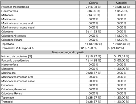 En los dos grupos analizados (tramadol, tapentadol y fentanilo transdérmico) fueron los opioides más pautados preoperatoriamente. El porcentaje de pacientes que recibían tratamiento concomitante con dos fármacos opioides fue similar en ambos grupos: control 16,27 %, ketamina 13,51 % (Tabla II).