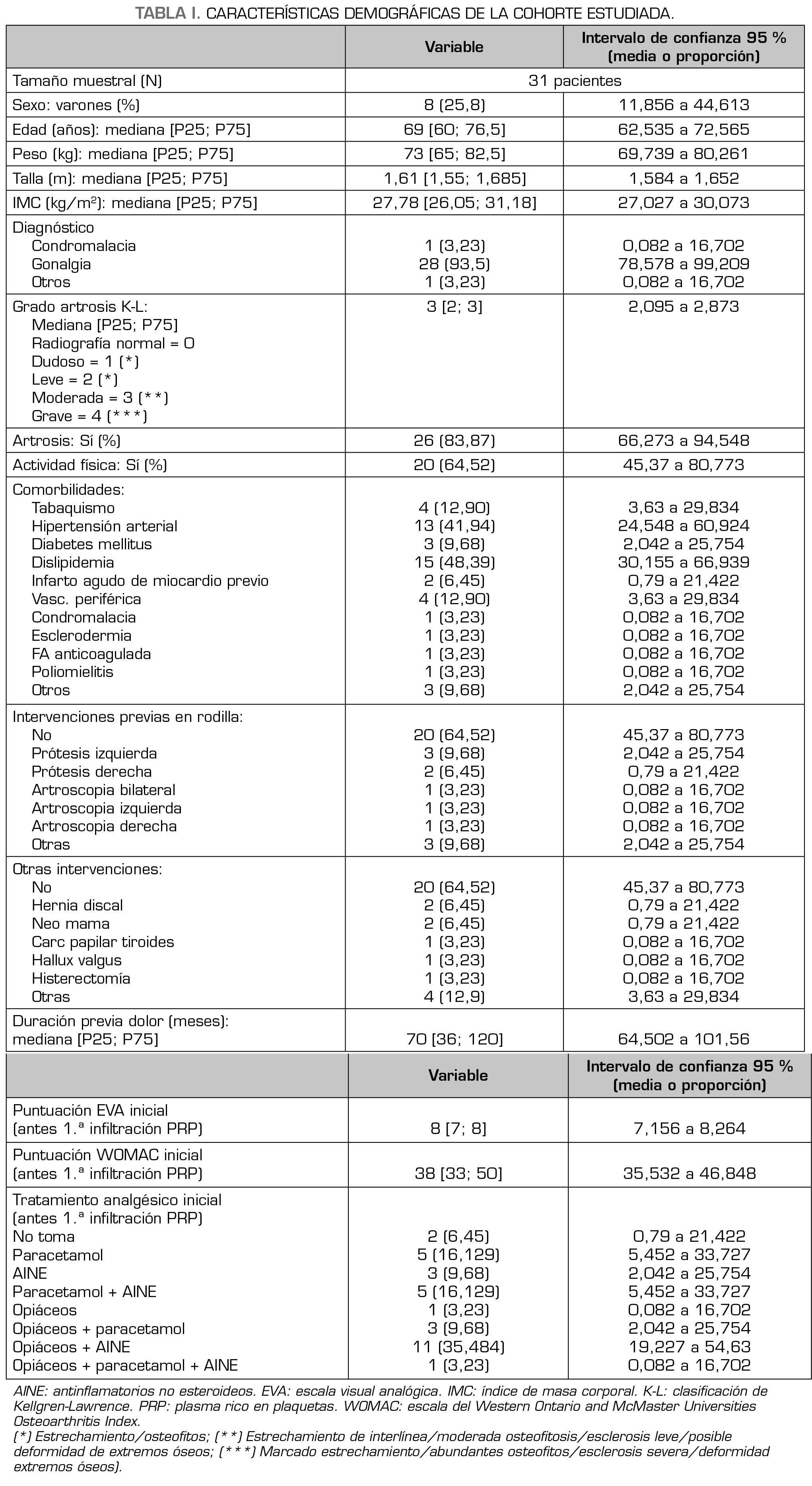 Pacientes y metodología: Se revisaron las historias clínicas de 31 pacientes, 8 hombres y 23 mujeres, desde enero de 2018 a enero de 2022, diagnosticados de gonalgia crónica por artrosis. A los pacientes se les había administrado 3 sesiones de infiltración de PRP espaciadas cada 3 semanas, con una duración total del tratamiento de 9 semanas y un seguimiento de la escala EVA y WOMAC hasta los 24 meses.