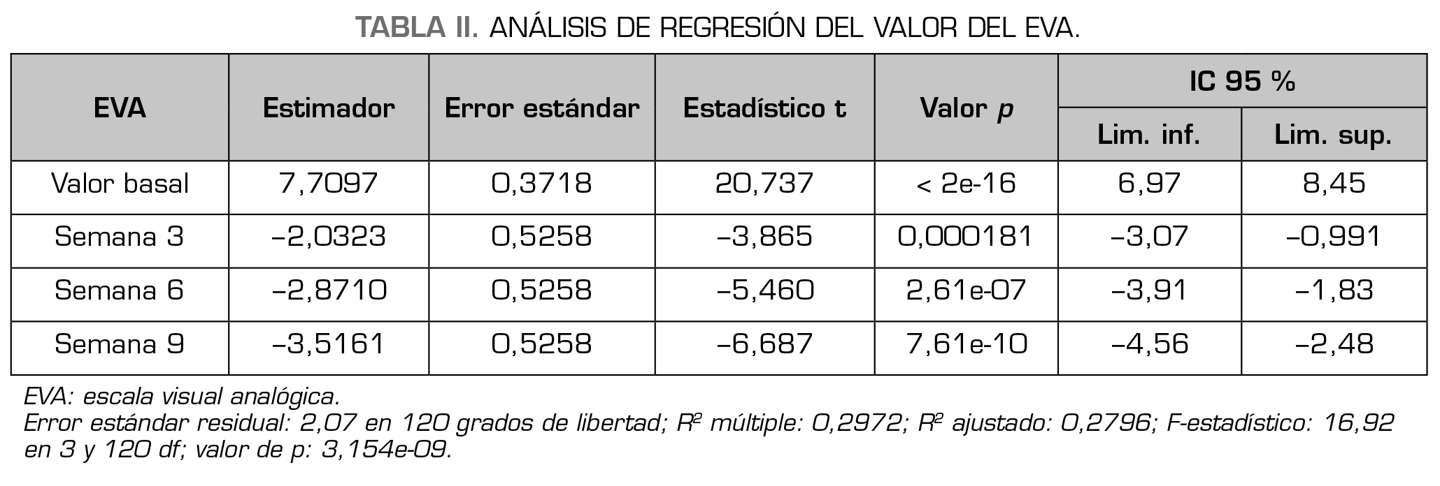Resultados: Todos los pacientes presentaron mejoría en las escalas EVA y WOMAC tras cada una de las inyecciones de PRP, siendo estadísticamente significativa en la semana 9 (3ª inyección). Objetivamos que, de manera estadísticamente significativa, los pacientes obesos tienen una peor evolución del resultado del tratamiento. Se produjo un cambio en la distribución porcentual de las modalidades de tratamiento analgésico, aunque este cambio no alcanzó significación estadística. La duración del efecto del tratamiento tuvo una mediana de 8 meses [P25: 4 meses; P75: 13 meses] (IC 95 % de la media = 6,78 a 11,61) después de la última infiltración.