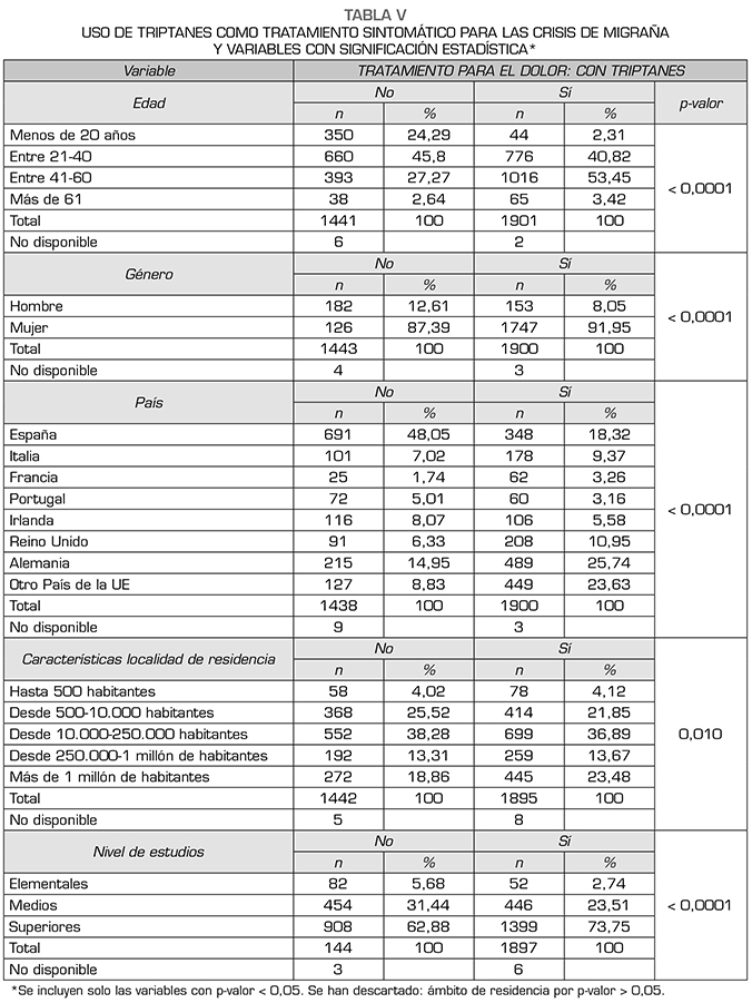 El uso de triptanes muestra relación con la edad y el género, mayor uso entre 21-60 años (p < 0,0001) y en mujeres (p < 0,0001). Por países, el mayor consumo es en Alemania, resto de países de Unión Europea, España y Reino Unido (p < 0,0001). Mayor consumo en pacientes que viven en ciudades de más de 500 habitantes (p < 0,010) y con estudios medios o superiores (p < 0,0001). En el grupo de estudios medios y superiores se encuentra por contraste el mayor porcentaje de pacientes que desconocen qué es un tratamiento sintomático (p < 0,0001).