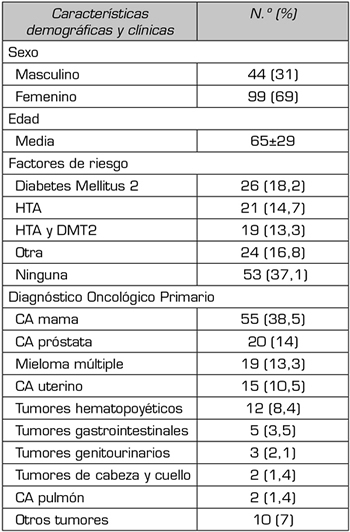 Resultados: Se analizaron 143 pacientes quienes fueron en mayor porcentaje mujeres (69 %) con una media de edad de 65 años. Los factores de riesgo identificados más frecuentes fueron diabetes mellitus tipo 2 (18,2 %) e hipertensión arterial (14,7 %). Los diagnósticos oncológicos de mayor frecuencia fueron cáncer de mama (38,5 %), cáncer de próstata (14 %), mieloma múltiple (13,3 %) y cáncer cervicouterino (10,5 %). Los opioides utilizados fueron tramadol (48,3 %), morfina (32,2 %), buprenorfina y tapentadol (5,6 %), oxicodona (1,4 %), fentanilo y metadona (0,7 %). Los abordajes intervencionistas en mayor proporción fueron depósito de esteroides en ramo dorso medial de articulación cigoapofisiaria lumbar de 3 segmentos (11,2 %), depósito de esteroides de ramo dorso medial de articulación cigoapofisiaria lumbar de 4 o más segmentos el (7,7 %) y vertebroplastia (5,6 %). Además se observó que el 60,8 % de los pacientes recibió más de un abordaje intervencionista. La respuesta terapéutica mayor o igual al 50 % se presentó en el 86,7 % de los pacientes y el 35,7 % mostró una media de reducción de opioides de 22,2 miligramos/día. La lumbalgia con componente neuropático se presentó en el 57,3 % de los pacientes. De acuerdo con la evaluación de la escala verbal análoga antes y a la semana postratamiento, se observaron cambios de dolor leve del 8,4 al 77,6 %, dolor moderado