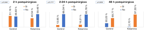 Resultados: Los pacientes del grupo ketamina presentaron EVN inferiores a los del grupo control durante las dos primeras horas postoperatorias (p = 0,001) y menores necesidades de rescates de morfina en el segundo día postoperatorio (p = 0,003). La necesidad de perfusión continua de morfina-ketamina fue significativamente inferior a la necesidad de inicio de perfusión continua de morfina en el grupo control (p = 0,011).
