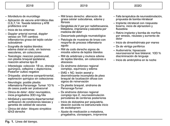 Caso clínico: Se le realizaron varias pruebas diagnósticas e imágenes como ecografías, resonancia magnética y estudios electrofisiológicos los cuales confirmaron el diagnóstico de neuritis braquial (síndrome de Parsonage-Turner). El paciente recibió intervenciones quirúrgicas con fascitomías y neurólisis, además de múltiples manejos farmacológicos para dolor, incluyendo opioides fuertes, neuromoduladores, antidepresivos y medicamentos por bomba intratecal, con disminución solo del 50 % de los síntomas de dolor y afectación a su calidad de vida.