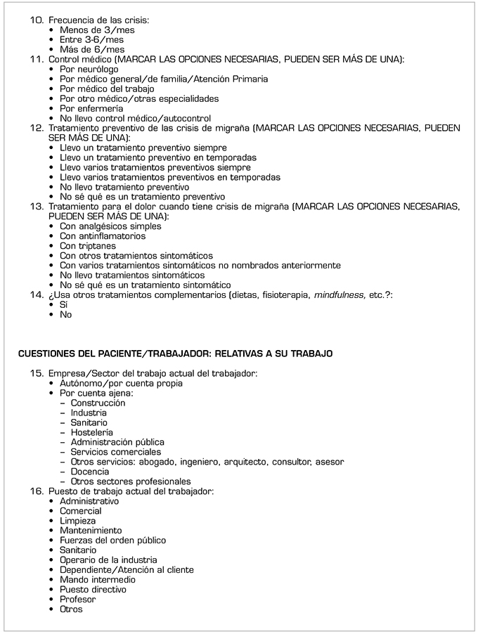 Estudio observacional transversal a partir de una encuesta anónima vía web ubicada en la página de la European Migraine and Headache Alliance (EMHA) y avalada científicamente por la asociación española de especialistas en medicina del trabajo (AEEMT) a 3342 pacientes de España, Italia, Francia, Portugal, Irlanda, Reino Unido, Alemania y otros países de la Unión Europea no incluidos entre los anteriores. Se consideran criterios de inclusión tener un diagnóstico previo de migraña, estar trabajando en el momento de la encuesta o haberlo estado en el año previo, y participación voluntaria. Se recogen datos desde septiembre de 2018 hasta enero de 2019. La encuesta consta de 32 cuestiones con respuesta múltiple (Anexo 1).