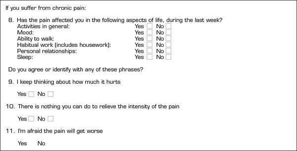 With the preoperative survey, adapted from the Brief Pain Inventory (10) (BPI) (Appendix A), we explored the presence of pain, anxiety, depression and catastrophic thinking.