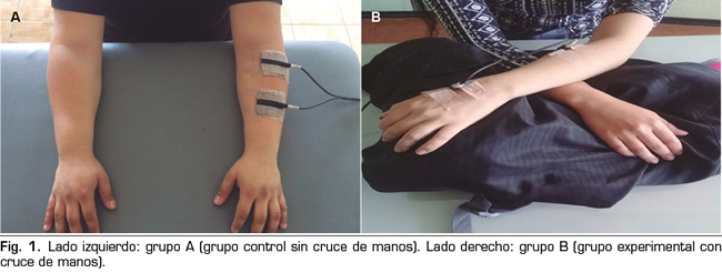 Material y método: 16 pacientes con dolor crónico de codo, muñeca o mano ingresaron al estudio. Fueron aleatorizados en un grupo experimental, que recibió la aplicación de electroanalgesia nerviosa transcutánea (TENS) con cruce de manos y ojos cerrados, además de un grupo control, que recibió solo electroanalgesia. A cada grupo se les evaluó su dolor pre y postintervención, con el cuestionario del dolor de McGill y la escala visual análoga (EVA).