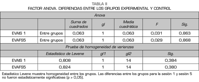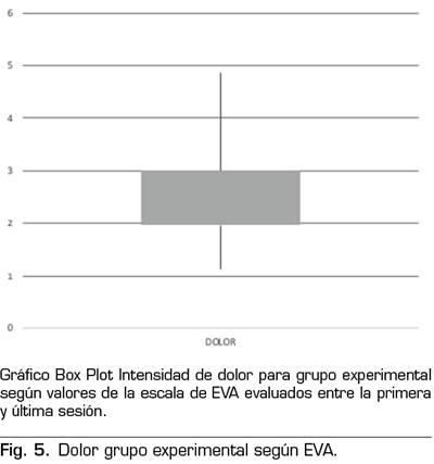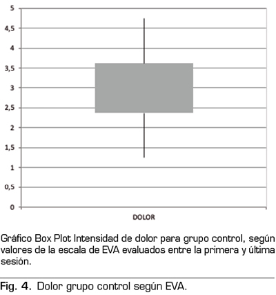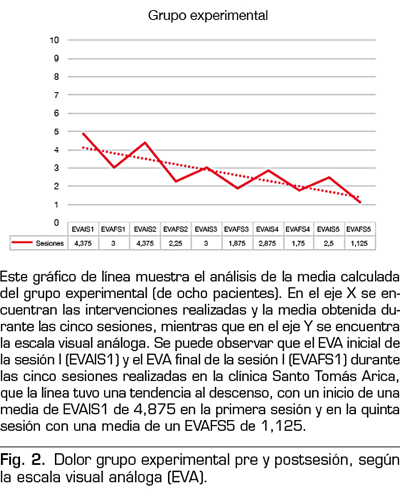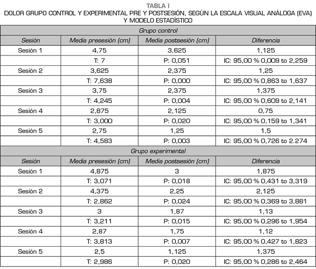 Resultados: Ambos grupos, el control y experimental, presentaron una disminución en el dolor postintervención; el grupo control disminuyó una media de 3,5 cm y el grupo experimental con una media de 3,75 cm. Todas las sesiones del grupo experimental fueron estadísticamente significativas (p < 0,05), mientras que el grupo control presentó una sesión no estadísticamente significativa (p = 0,051). El análisis de varianza (ANOVA) entre ambos grupos, sin embargo, no dio estadísticamente significativo (p = 0,863).