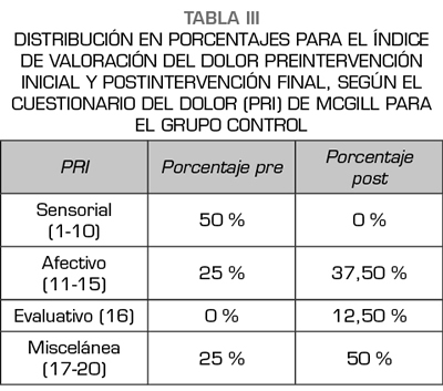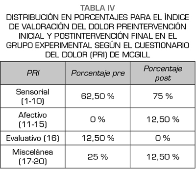 Results: A decrease in post-intervention pain was observed in both groups; where the control group decreased an average of 3.5 cm and the experimental group 3.75 cm. All sessions of the experimental group were statistically significant (P = <0.05), while one session in the control group was not statistically significant (P = 0.051). However, the Analysis of variance (ANOVA) between both groups, did not give statistically signifi cant (p = 0.863).