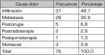 Results: A total of 78 patients were analyzed, 63,2 % men and 46,8 % women. The average age was 64,84 ± 12,623 years. 44,7 % were sent by surgical services. In 75% the pain was moderate or severe. The main cancer location was abdominal (31,6 %), and head and neck (22,4 %). In 48,7 % the pain was originated by tumoral infiltration and in 60,5 % the pain was judged to be mixed. At the moment of the arrival 60 % of patients were on opioids, with an average dose of 163,57 ± 167,10 mg EDM and 38 % were on antineurophatic drugs. The average time to attend the patients from the moment or request was 9,18 ± 9,73 days. A minor interventional procedure was performed in 56,6 % (43) of the patients, and a major intervention in 2,6 % (2). We started antineurophatic drugs in 68,4 % of the cases. During the period of pain management in our unit a 72,4% of the patients referred an improvement of their cancer related pain.