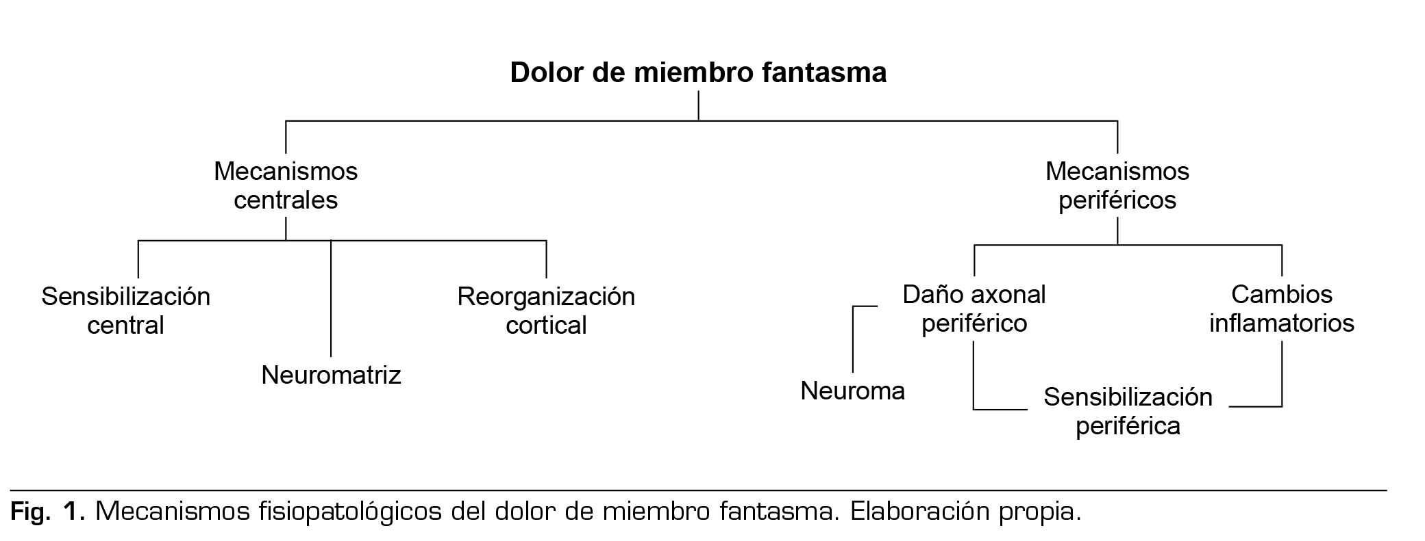 El dolor de miembro fantasma (DMF) es un fenómeno descrito desde el Renacimiento; sin embargo, pese al paso de los siglos, sus mecanismos fisiopatológicos aún no se comprenden completamente. Tradicionalmente se ha clasificado como un tipo de dolor neuropático debido al daño nervioso y a las sensaciones dolorosas referidas por los pacientes; no obstante, puede considerarse una entidad clínica particular, con características propias y procesos fisiopatológicos que trascienden los del dolor neuropático clásico, como la reorganización cortical y la participación de la neuromatriz del dolor. Los mecanismos fisiopatológicos se dividen en periféricos y centrales. Los periféricos son los relativos al daño de nervio o segunda neurona, y los centrales a las transformaciones cerebrales que ocurren posterior a la amputación. Son los mecanismos centrales los que hasta el momento han explicado mejor el DMF y los que justifican la mayoría de los tratamientos tanto farmacológicos como no farmacológicos.