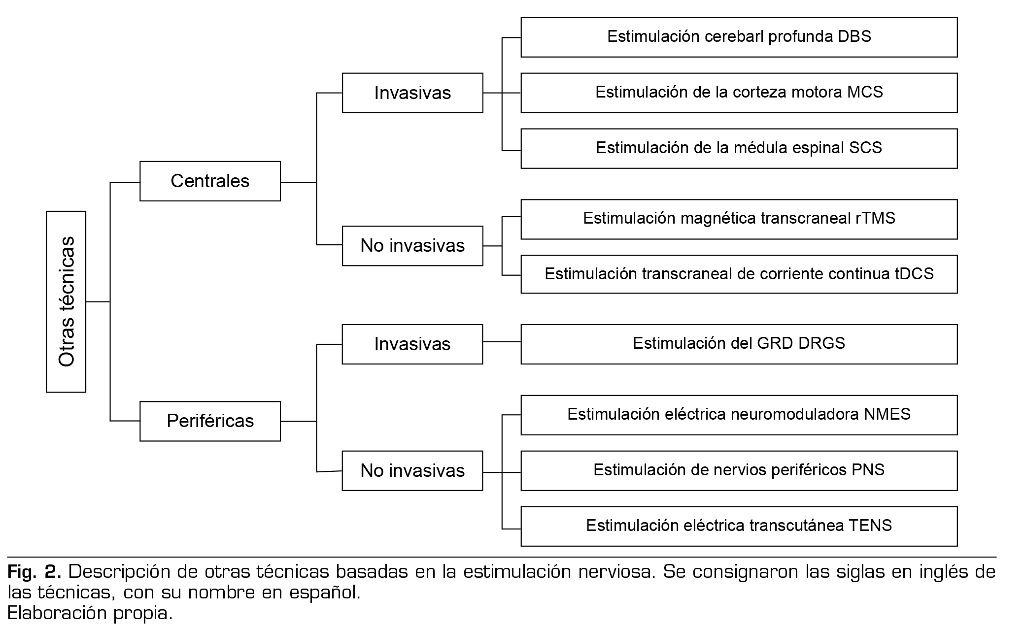 Se han descrito intervenciones invasivas centrales como la estimulación cerebral profunda, la estimulación de la corteza motora) y la estimulación de la médula espinal; y periféricas, como la estimulación del ganglio de la raíz dorsal. Asimismo, estimulaciones centrales no invasivas como la estimulación magnética transcraneal, la estimulación transcraneal de corriente directa, incidiendo en la reorganización cortical maladaptativa anteriormente descrita (9,78). Además, técnicas periféricas como TENS, estimulación eléctrica neuromoduladora y estimulación de nervios periféricos. Esta estimulación periférica activa las fibras A-Beta lo cual mitiga la actividad nociceptiva de las fibras A-Delta y de las fibras C, inhibiendo las vías del dolor por la médula espinal, generando su efecto analgésico (78). En una revisión sistemática con un total de 123 pacientes, encontraron que las técnicas de estimulación central no invasivas tenían una buena evidencia en cuanto a disminución del dolor, siendo la estimulación transcraneal de corriente directa la de mejor rendimiento estadístico tanto a corto como a largo plazo frente la estimulación magnética transcraneal, con una frecuencia de 10 Hz (79) (Figura 2).