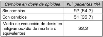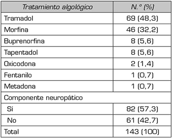 Resultados: Se analizaron 143 pacientes quienes fueron en mayor porcentaje mujeres (69 %) con una media de edad de 65 años. Los factores de riesgo identificados más frecuentes fueron diabetes mellitus tipo 2 (18,2 %) e hipertensión arterial (14,7 %). Los diagnósticos oncológicos de mayor frecuencia fueron cáncer de mama (38,5 %), cáncer de próstata (14 %), mieloma múltiple (13,3 %) y cáncer cervicouterino (10,5 %). Los opioides utilizados fueron tramadol (48,3 %), morfina (32,2 %), buprenorfina y tapentadol (5,6 %), oxicodona (1,4 %), fentanilo y metadona (0,7 %). Los abordajes intervencionistas en mayor proporción fueron depósito de esteroides en ramo dorso medial de articulación cigoapofisiaria lumbar de 3 segmentos (11,2 %), depósito de esteroides de ramo dorso medial de articulación cigoapofisiaria lumbar de 4 o más segmentos el (7,7 %) y vertebroplastia (5,6 %). Además se observó que el 60,8 % de los pacientes recibió más de un abordaje intervencionista. La respuesta terapéutica mayor o igual al 50 % se presentó en el 86,7 % de los pacientes y el 35,7 % mostró una media de reducción de opioides de 22,2 miligramos/día. La lumbalgia con componente neuropático se presentó en el 57,3 % de los pacientes. De acuerdo con la evaluación de la escala verbal análoga antes y a la semana postratamiento, se observaron cambios de dolor leve del 8,4 al 77,6 %, dolor moderado