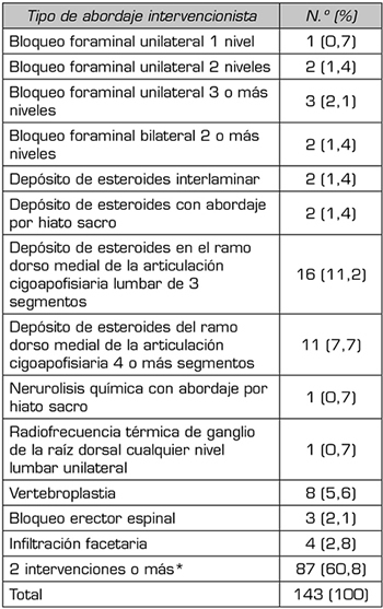 Conclusions: Steroid deposition in dorsal medial branch of the lumbar zygapophyseal joint of 3 segments, 4 or more segments and vertebroplasty were the most frequent approaches. Therapeutic response greater than or equal to 50 % was presented in 86.7 % of patients, however, due to the multiple etiology of this condition, administering different