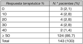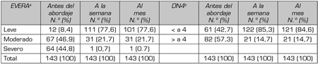 En cuanto a la evaluación del cuestionario Douleur Neuropathique-4 ítems antes del abordaje terapéutico, el 42,7 % de los pacientes presentaron una puntuación menor a 4, mientras que el 57,3 % presentó un puntaje mayor a 4. A la semana el porcentaje fue del 85,3 y 14,7 %, respectivamente, y posterior al mes el 84,6 % de los pacientes presentó una puntación menor a 4.