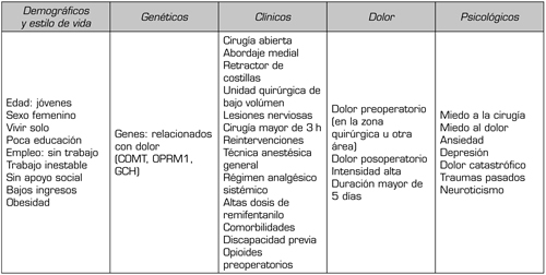 Se han identificado cinco categorías de ellos: demográficos, genéticos, clínicos, relacionados con la cirugía y psicológicos, de los cuales solo cuatro se pueden medir con herramientas validadas (dolor, funcionamiento físico, funcionamiento psicológico y calificación global del resultado (15,16,24-26) (Tabla III).