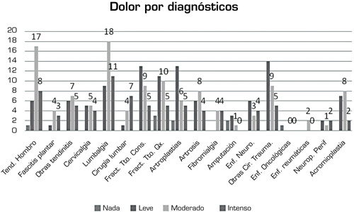 Conclusions: The prevalence of patients with pain seen in the Rehabilitation Services is very high. It is necessary to set regular checks to identify the pain before and during the treatment techniques, as well asanalgesic protocols according to its intensity.