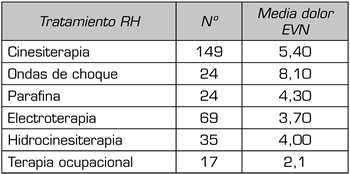 Resultados: De 318 pacientes, el 94,9 % presentaban dolor, edad media 58,7 años, siendo el 67,4 % mujeres. Las patologías musculoesqueléticas (88,4 %) y el dolor nociceptivo, crónico y discontinuo fueron la causa y el tipo más frecuentes. La intensidad media del máximo dolor percibido con EVN fue de 5,7 y durante el tratamiento de 4,8. Las ondas de choque y la cinesiterapia fueron las técnicas más dolorosas. El 36,4 % no tomaban analgésicos.